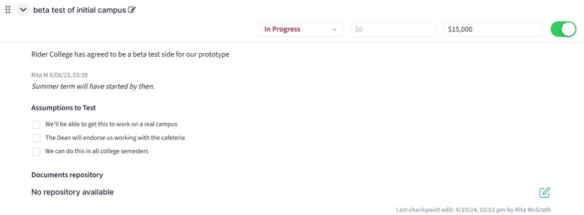 Our first effort to instrument the discovery driven growth system was to try to design Excel-based spreadsheets that would show how to use parts of the system. Among the problems we ran into were that every business is slightly different, so designing templates was hard. Further, people who weren’t used to thinking in a discovery driven way would slip back into conventional planning and the process would get distorted.