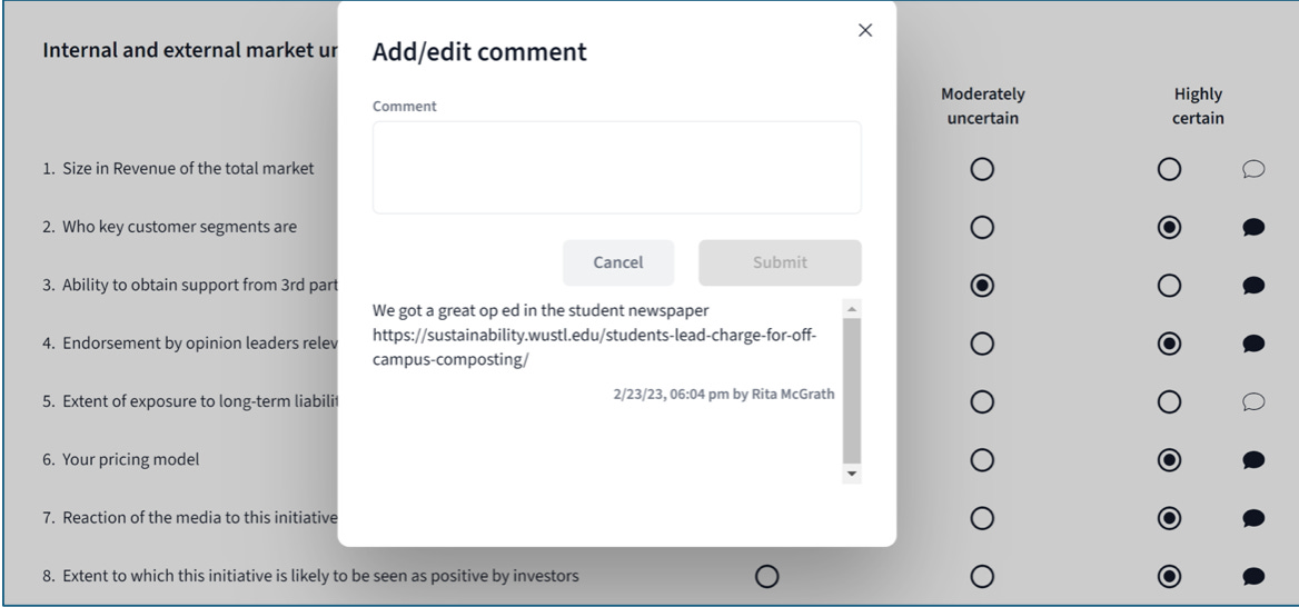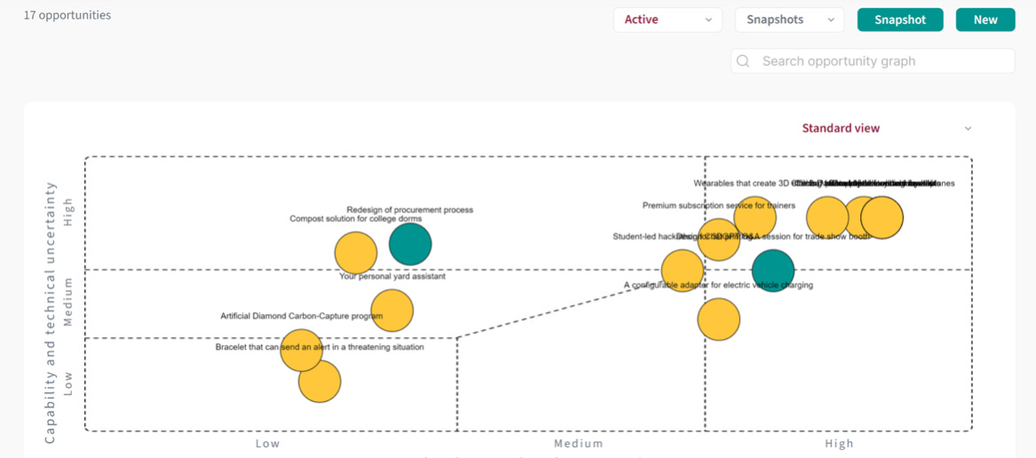 The uncertainties part of the software allows your team to score dimensions of uncertainty that my research suggests are critical to a project’s success. Further, teams can enter the explanation for why they scored it that way so we can go back in time and understand the logic for the score. As your team learns, projects go from upper right to lower left on the portfolio picture.