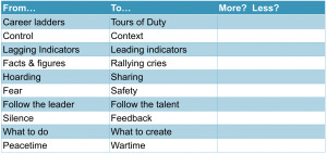 My point would be that if that’s what is going on outside your organization, you need to be able to create as much vibrancy inside your organization. But it is very hard for leaders to acknowledge that something is going to be going away when they have often invested a lifetime building the skills to make it a reality in the first place. We see this all the time—leaders who either deliberately or unwittingly fail to see that their environments may be about to change. A current example could well be Facebook, as evidence mounts that their business model is going to be severely challenged as times go forward.