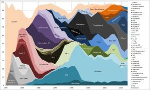 Take the gaming business. Over the last few decades, we’ve seen successive “waves” of games, from early arcade games, through the simple green-screen games to games available on CD, and today of course games played on phones and in massively multiplayer formats. The picture looks like this: